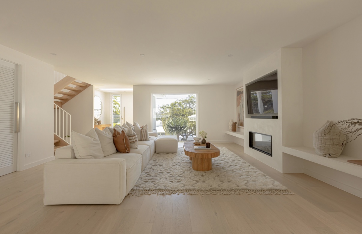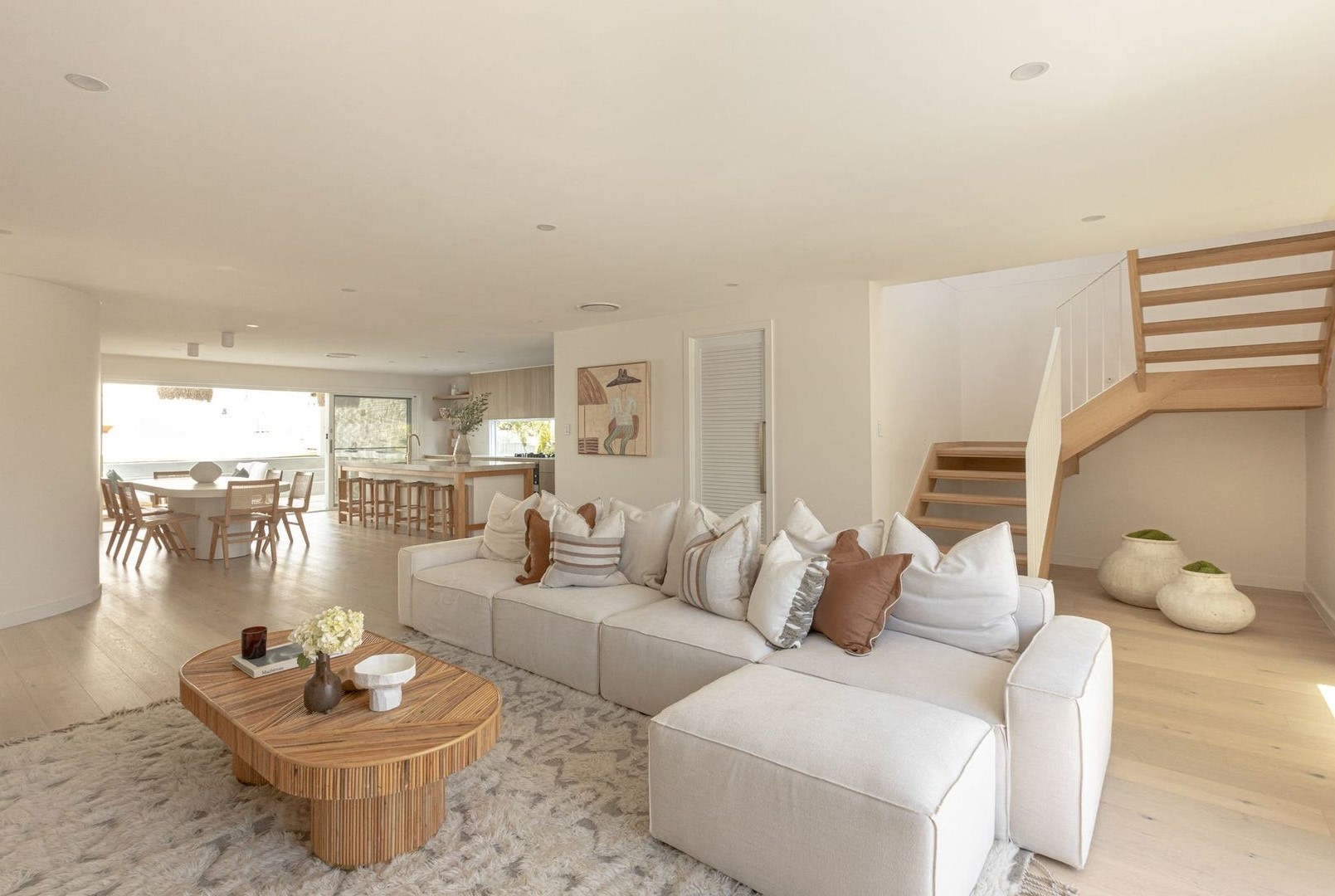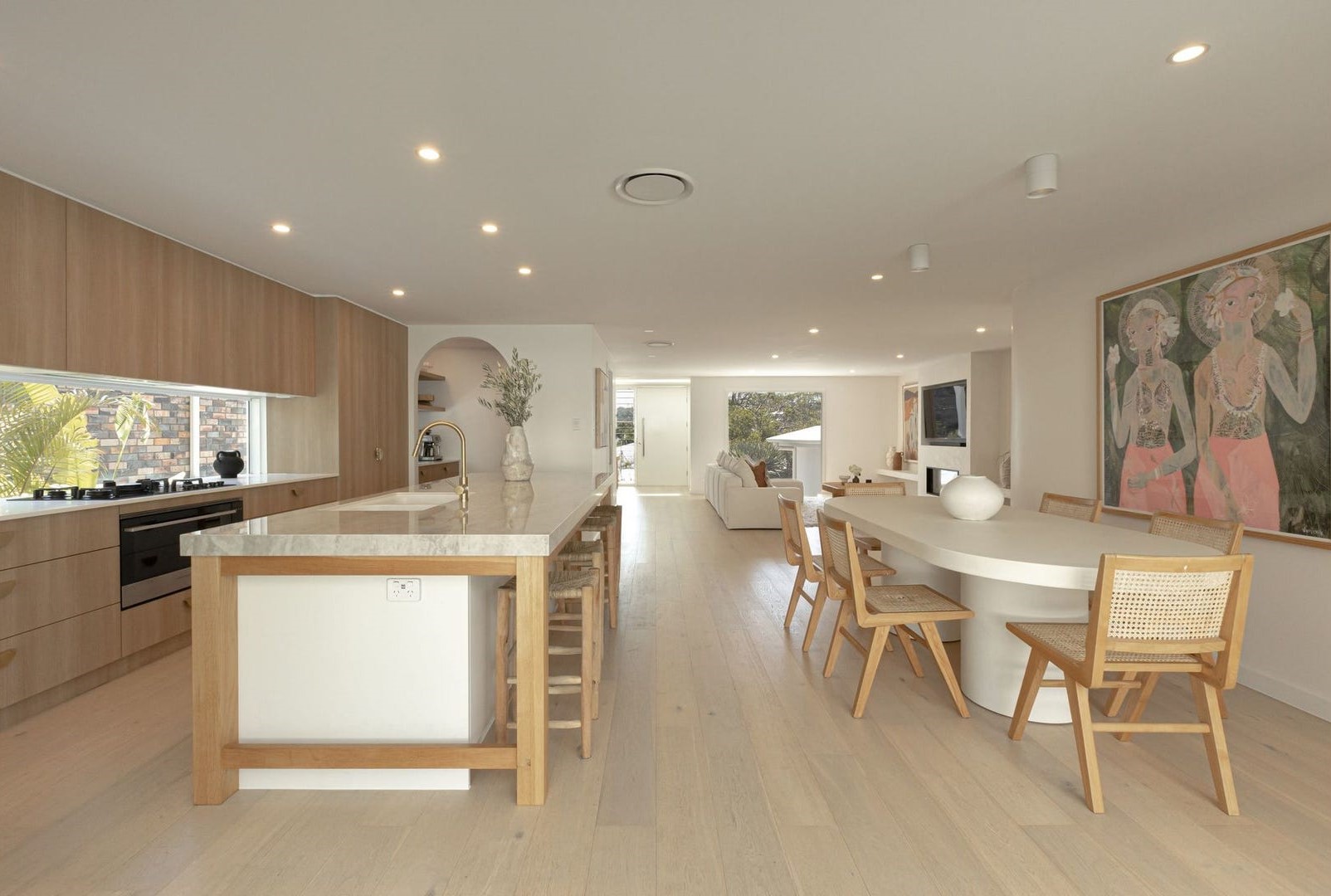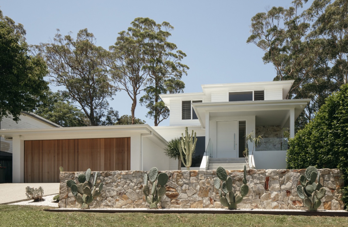A tired early 90s home needed a rework of the internal floor plan, a new double garage and a facelift. The kitchen was relocated to better connect with the existing rear yard and pool, the main living space opened up, a formal entry added to define public and private spaces, and a new double garage with internal access were all added. A clean white facade with a palette of stone, timber, render and weatherboard.